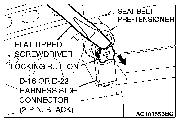 6. Connect the special tool adapter harness (MB991885), which the deployment wires is attached to, to the seat belt pre-tensioner connector.