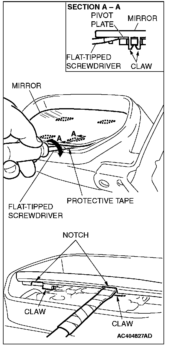 Slant the mirror upward with your hands. Then insert a flat-tipped screwdriver wrapped with protective tape between the pivot plate and mirror through the notch from behind the mirror. Now pry off the mirror claws and remove mirror as shown.
