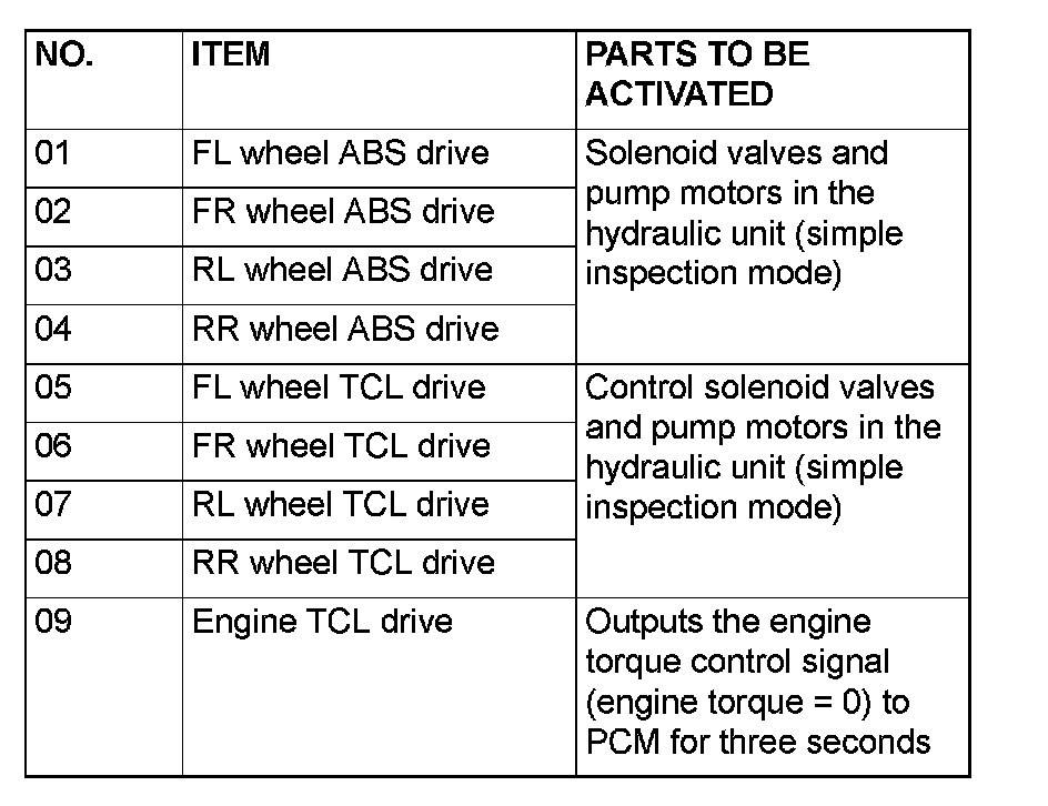 ACTUATOR TEST REFERENCE TABLEThe scan tool activates the following actuators for testing.
