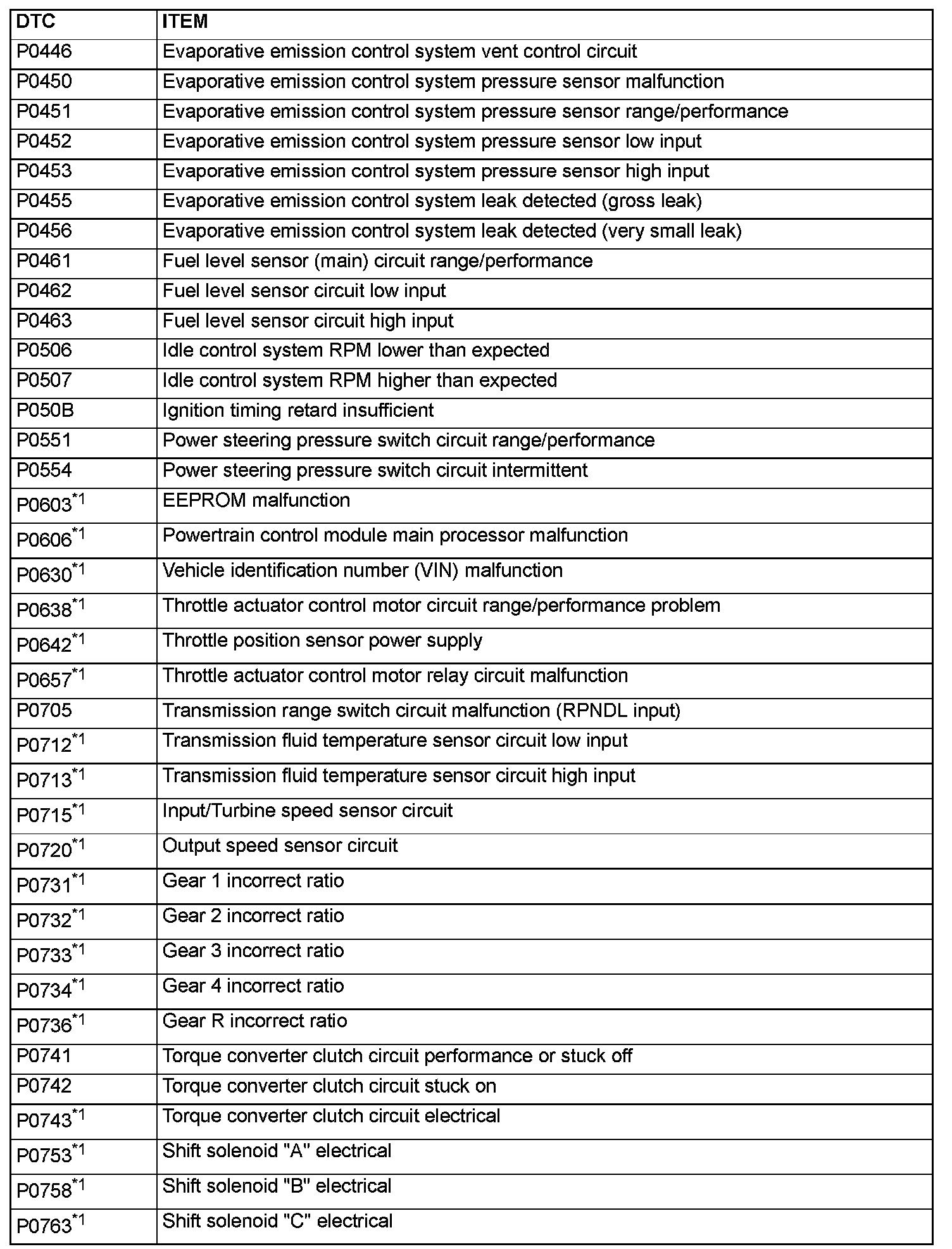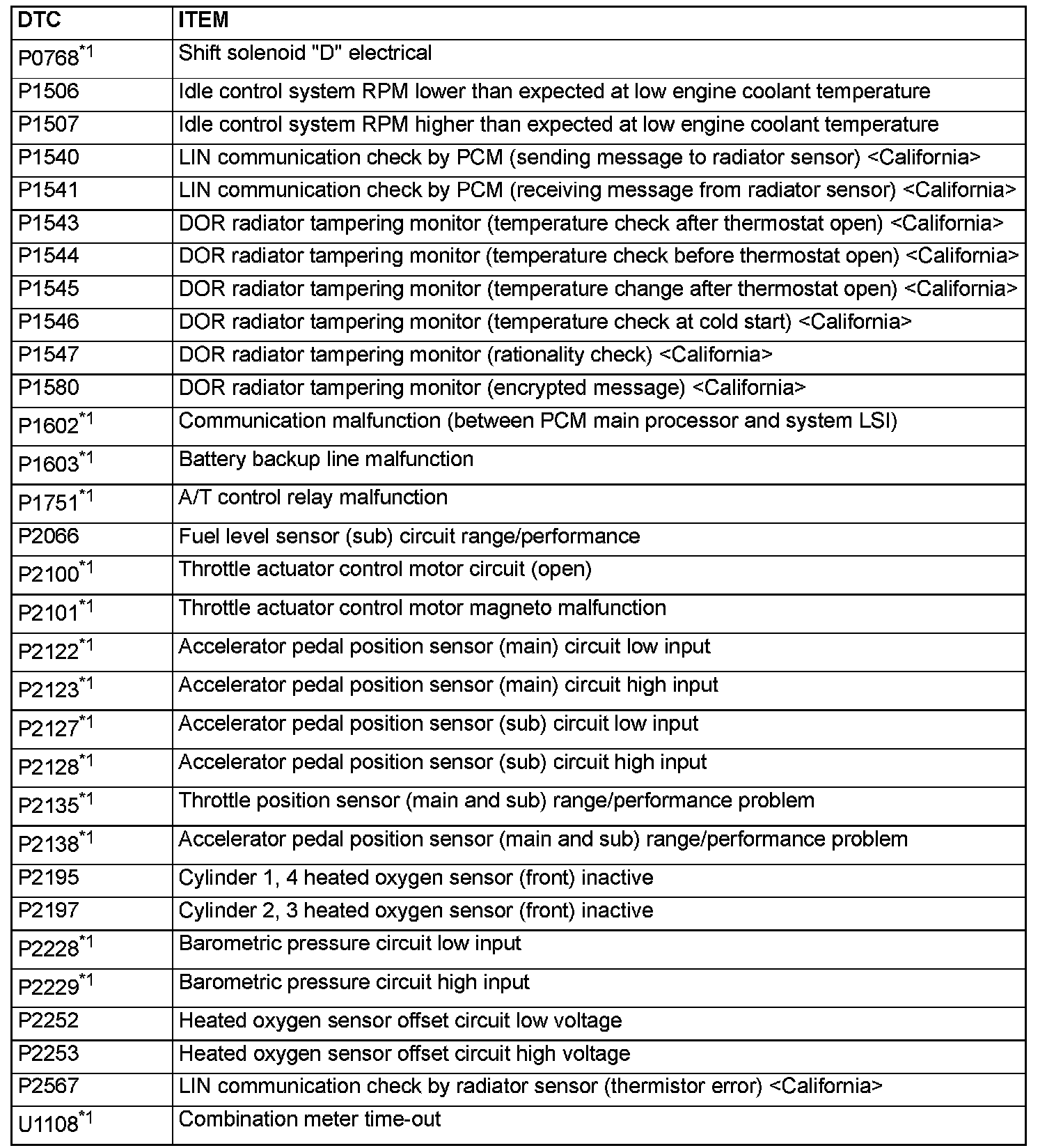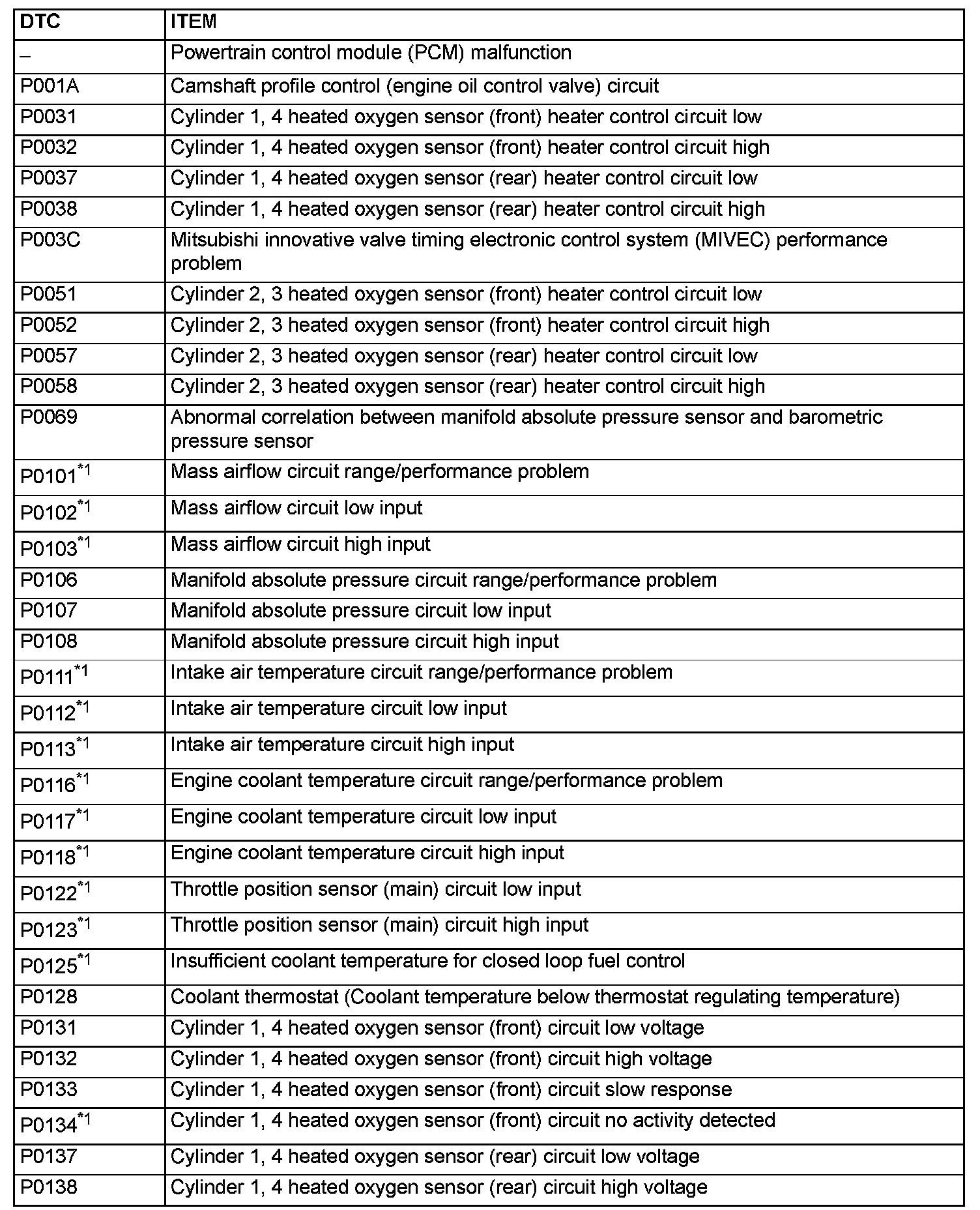 - After the PCM has detected a malfunction, the Malfunction Indicator Lamp (SERVICE ENGINE SOON or Check Engine Lamp) illuminates when the engine is next turned on and the same malfunction is re-detected. However, for items marked with a "*1" in the DTC NO. column, the Malfunction Indicator Lamp (SERVICE ENGINE SOON or Check Engine Lamp) illuminates only on the first detection of the malfunction.