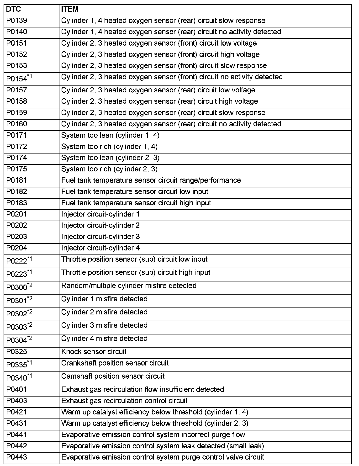 - The codes marked with a "*2" in the diagnosis code number column have the following two conditions for illuminating the Malfunction Indicator Lamp (SERVICE ENGINE SOON or Check Engine Lamp).