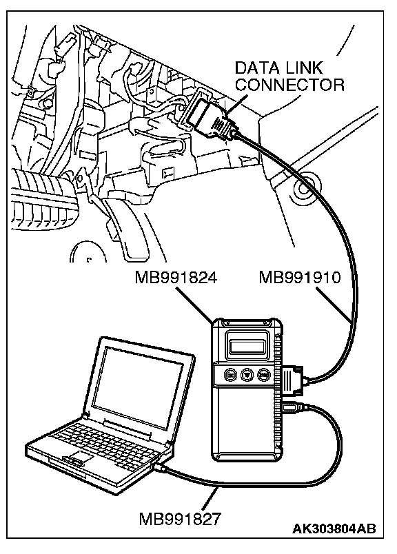 1. After the ignition switch is in "LOCK" (OFF) position, connect scan tool MB991958 to the data link connector.