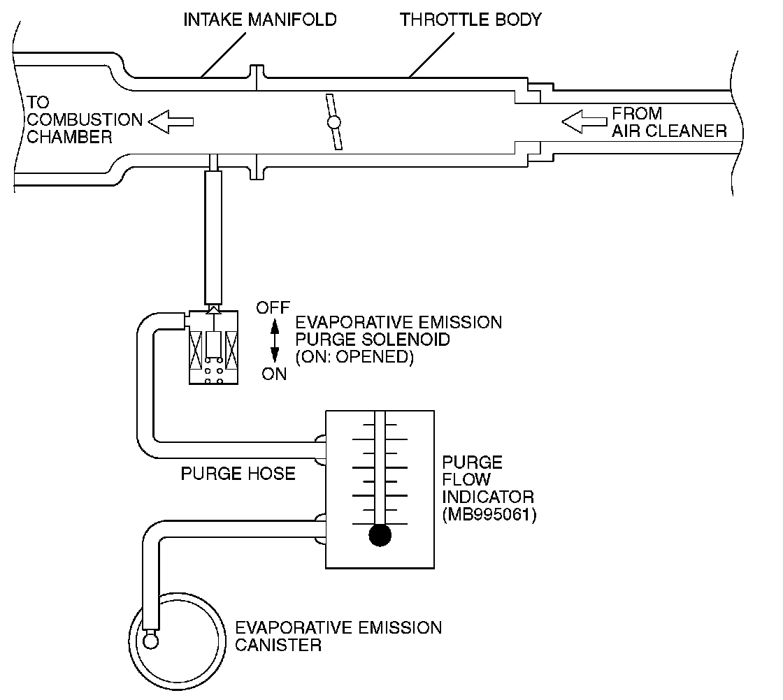 1. Disconnect the purge hose from the evaporative emission (EVAP) purge solenoid, and connect special tool MB995061 between the EVAP purge solenoid and the purge hose.