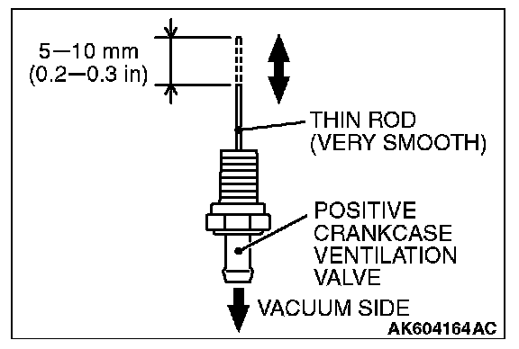 1. Hold the positive crankcase ventilation (PCV) valve with the vacuum side down. Insert a thin rod, and using light pressure, depress the end of the PCV valve spring by 5 - 10 mm (0.2 - 0.3 inch). Release pressure on the rod to see if the PCV valve spring will lift the rod to its original position.