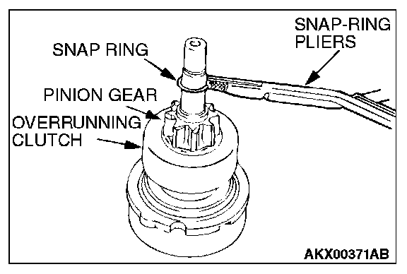 2. After removing the snap ring (by using snap-ring pliers), remove the stop ring and the overrunning clutch.