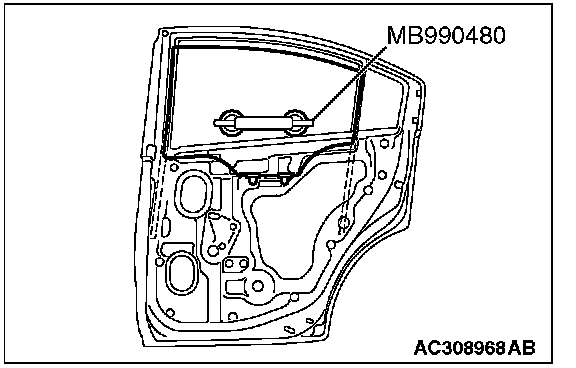 CAUTION: If tinting film is adhered to the door window glass, attach special tool MB990480 to the outside of the glass to prevent the film from peeling off.