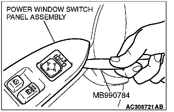 Insert special tool MB990784 as shown to remove the power window switch panel assembly.