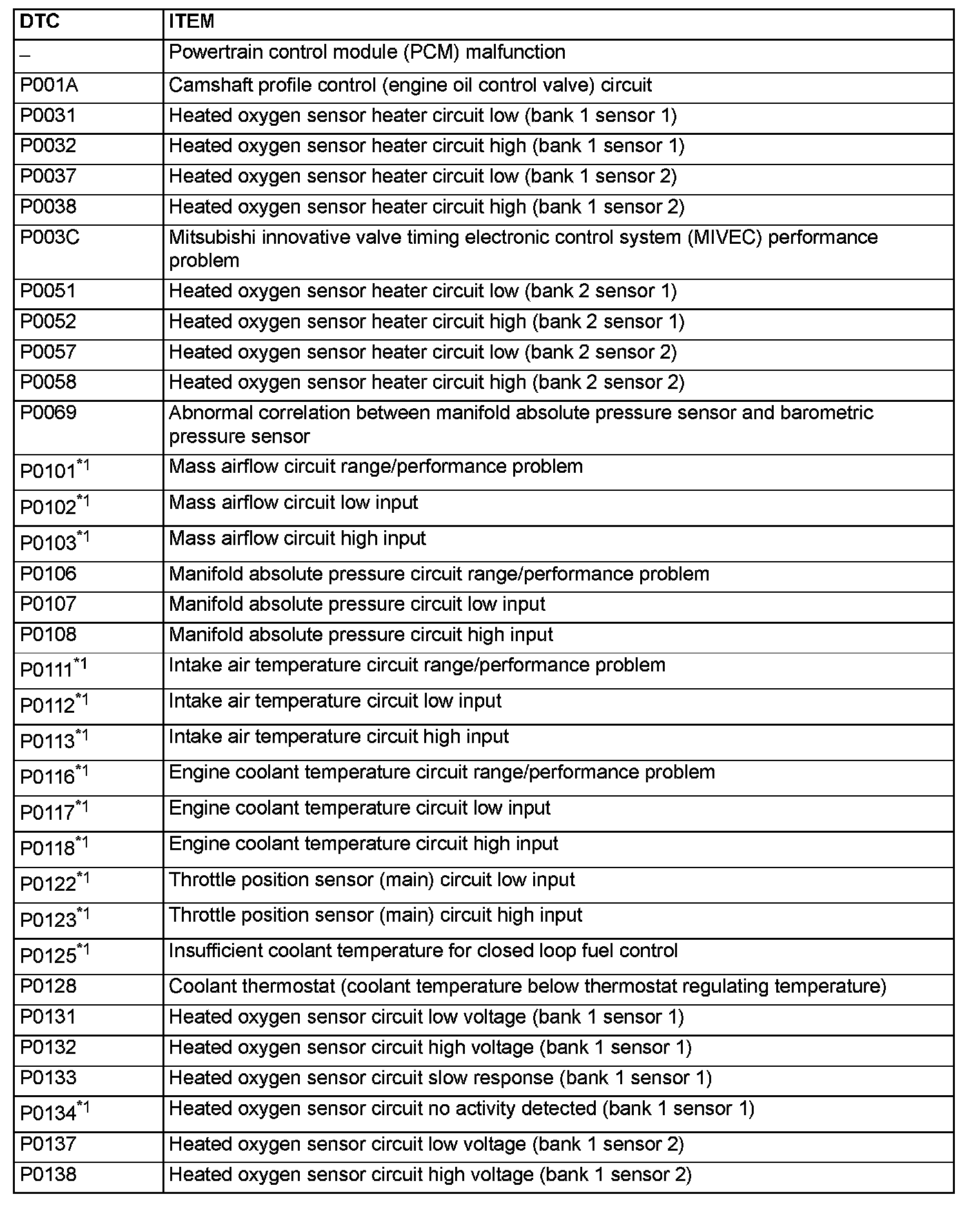 - After the PCM has detected a malfunction, the Malfunction Indicator Lamp (SERVICE ENGINE SOON or Check Engine Lamp) illuminates when the engine is next turned on and the same malfunction is re-detected. However, for items marked with a "*1" in the DTC NO. column, the Malfunction Indicator Lamp (SERVICE ENGINE SOON or Check Engine Lamp) illuminates only on the first detection of the malfunction.