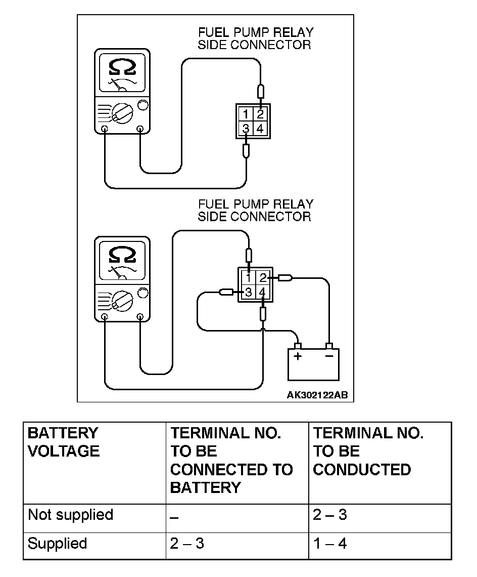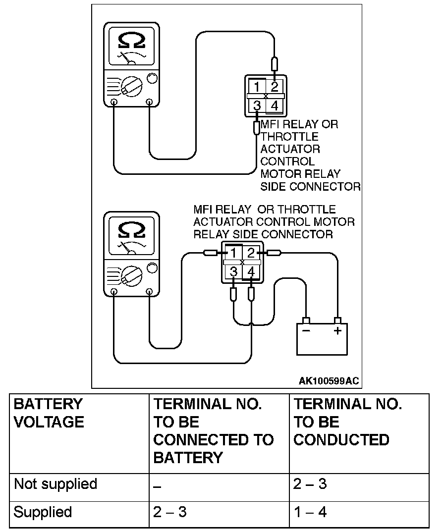 MULTIPORT FUEL INJECTION (MFI) RELAY AND THROTTLE ACTUATOR CONTROL MOTOR RELAY CONTINUITY CHECKInspect the MFI relay and throttle actuator control motor relay for continuity in accordance with the chart shown below.