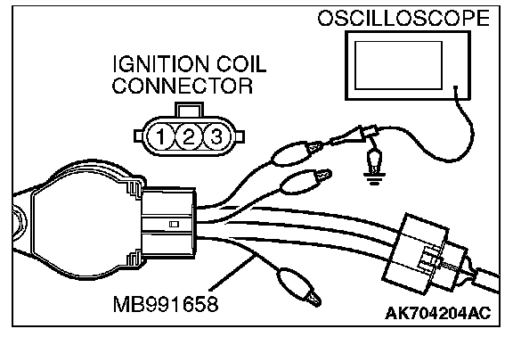 1. Disconnect the ignition coil connector, and connect test harness special tool (MB991658) between the separated connector. (All terminals should be connected.)