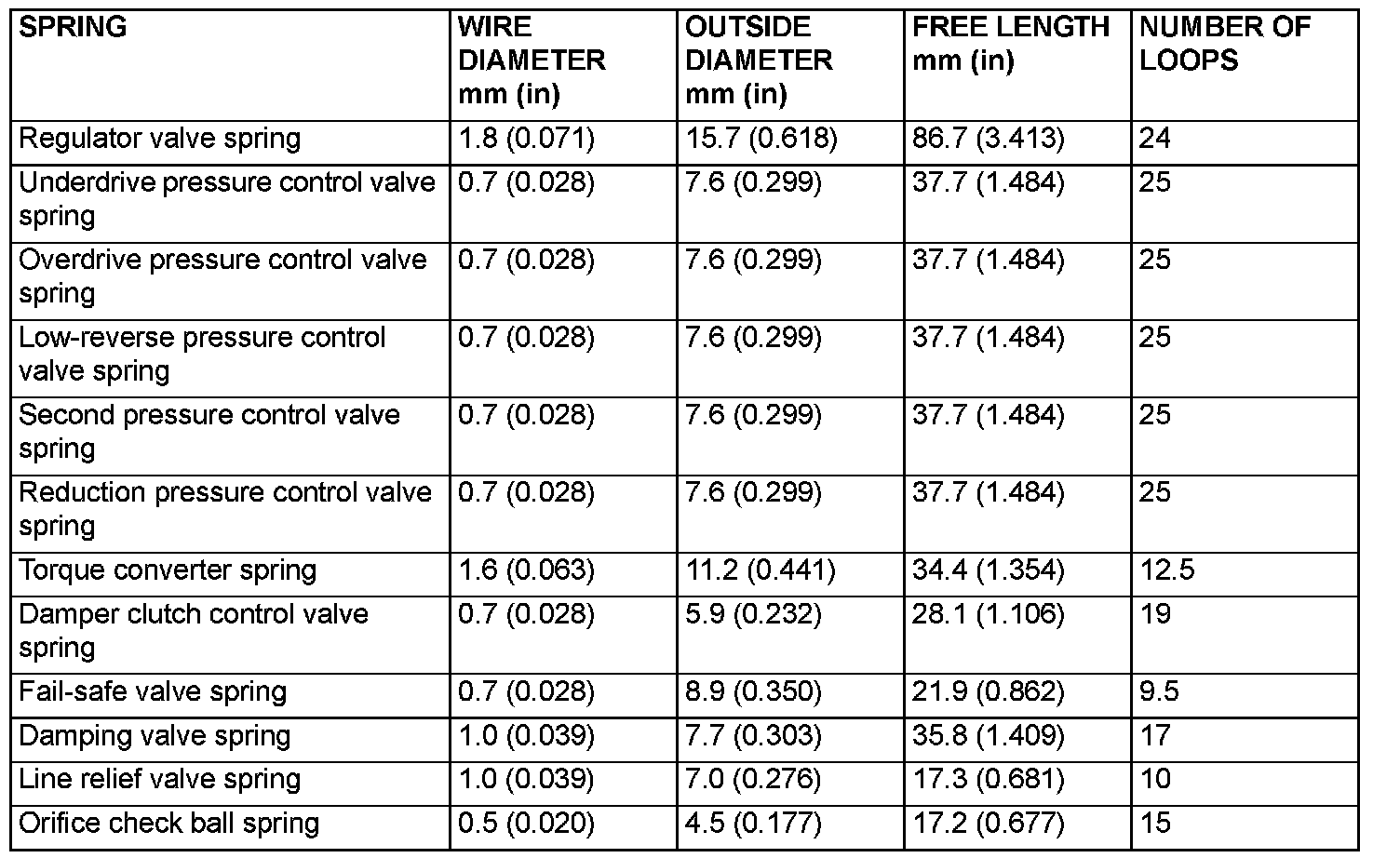 Valve Body Spring Identification Table