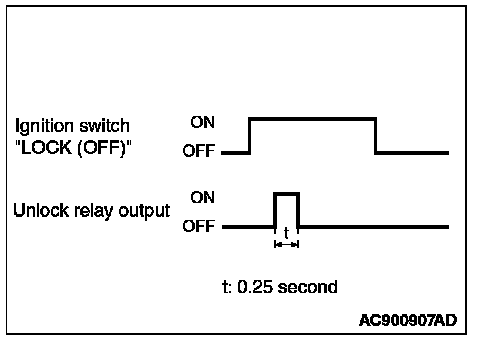 When the ignition switch is turned to the " LOCK (OFF)" position, ETACS-ECU turns the unlock relay output ON for 0.25 second to unlock all the doors.