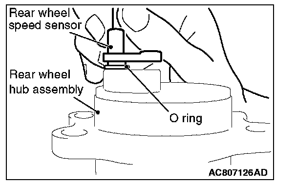 ^ Do not insert the rear wheel speed sensor at an angle or by prying the sensor because it may be possible that the O-ring of rear wheel speed sensor cannot be mounted properly.