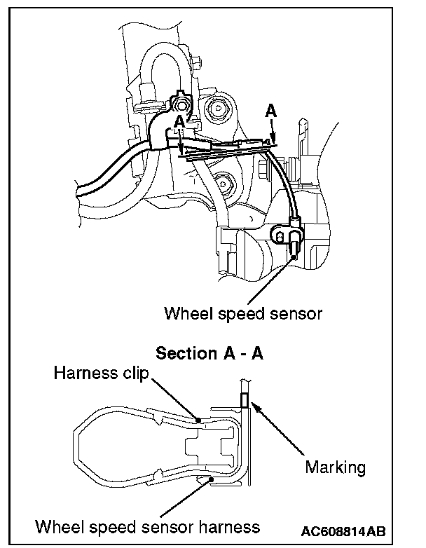 Install the front wheel speed sensor to the harness clip as shown in the figure.