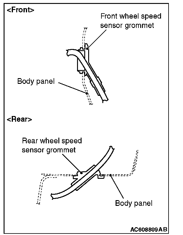 Install the front wheel speed sensor grommet and the rear wheel speed sensor grommet to the body panel snugly as shown in the figure.