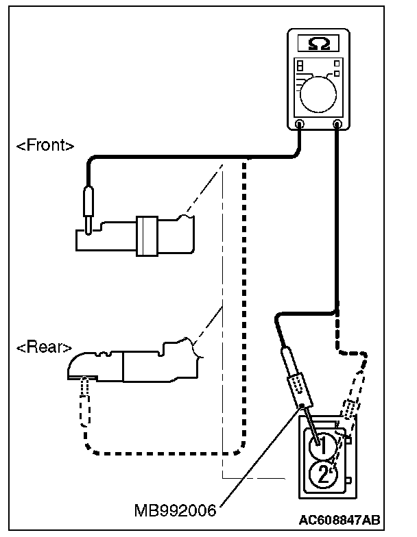 1. Connect the circuit tester to the wheel speed sensor using the special tool extra fine probe (MB992006), and measure the insulation resistance between terminal No. 1/2 and the wheel speed sensor body as a single unit.