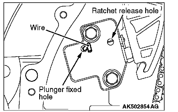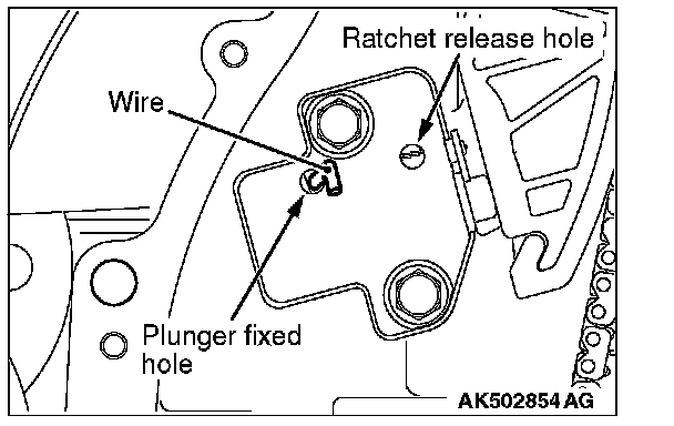 2. Push the tensioner lever by hand and push in the plunger of the timing chain tensioner until it hits the bottom. Then, insert a hard wire (piano wire or the like) of [diameter]1.5 or hexagonal bar wrench (1.5 mm [0.05 inch]) into the fixing hole of the plunger.
