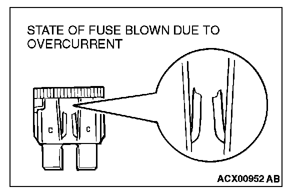 CAUTIONS IN EVENT OF BLOWN FUSEWhen a fuse is blown, there are two probable causes. One is that it is blown due to flow of current exceeding its rating. The other is that it is blown due to repeated on/off current flowing through it. Which of the two causes is responsible can be easily determined by visual check as described below.