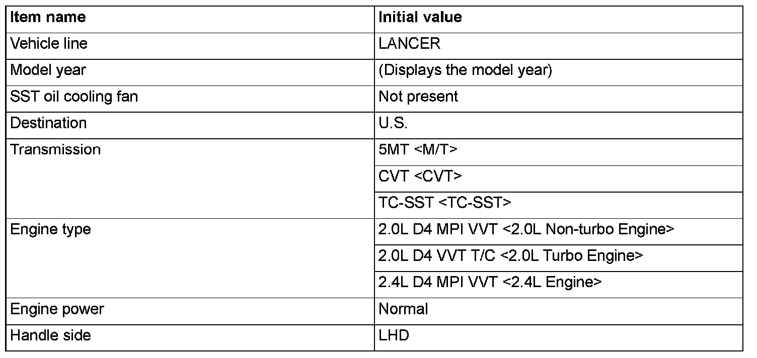 Before troubleshooting, check that the coding data written into the engine control module, TC-SST-ECU and ETACS-ECU are normal. If they are not the same as the initial settings, various functions and systems will not work correctly.