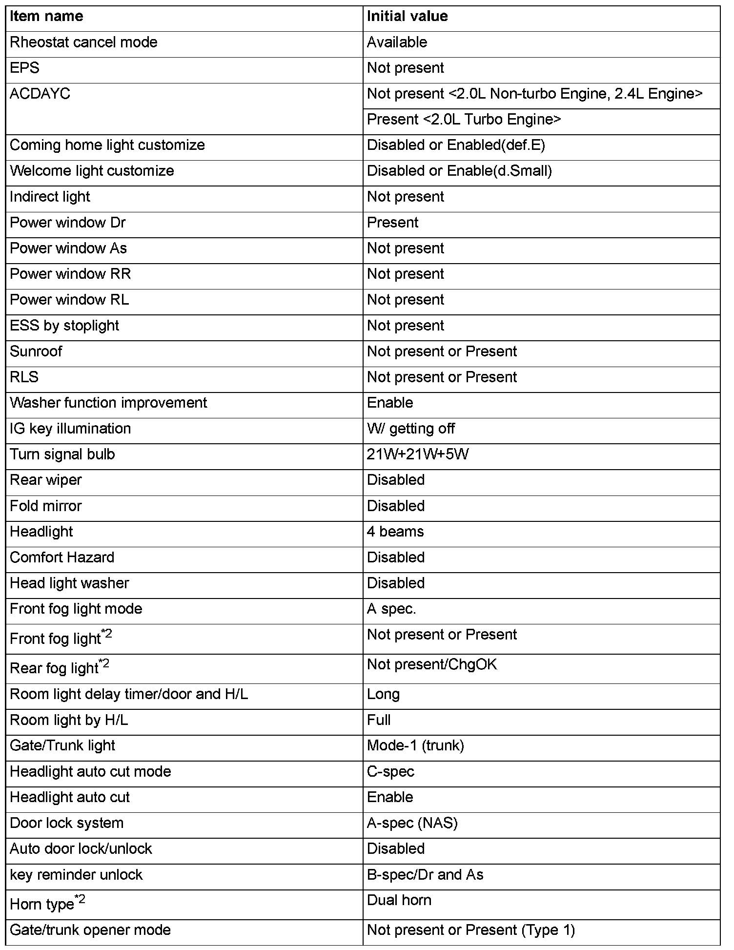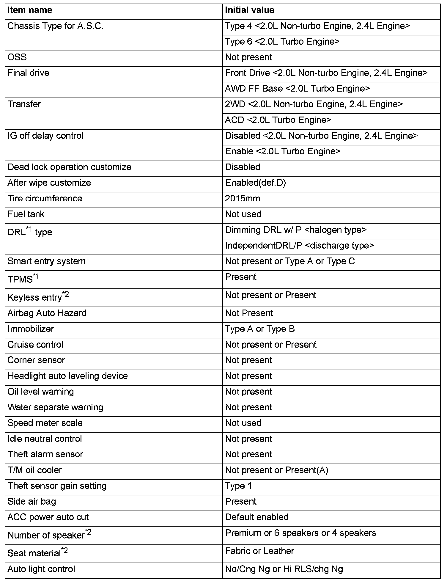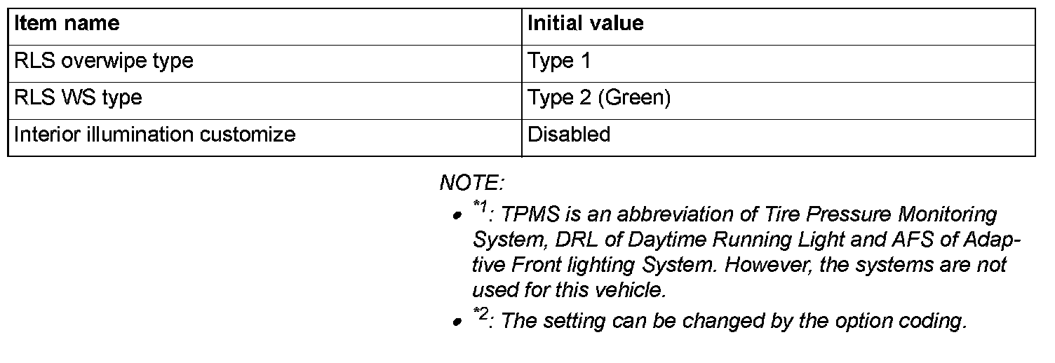 ^ If there is any item indicated by the option coding after equipment change, set ETACS-ECU so that the option coding data corresponds with the equipment content. Functions and systems do not work normally if the setting does not correspond with the equipment.