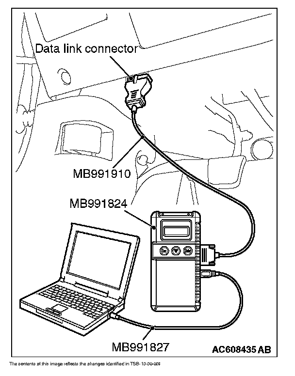 1. After the ignition switch is in "LOCK" (OFF) position, connect scan tool MB991958 to the data link connector.