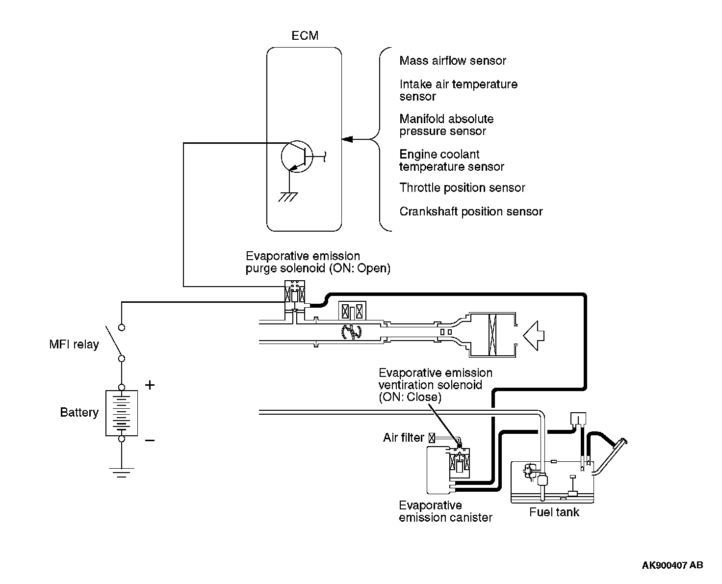 An EVAP ventilation solenoid is provided between the EVAP canister and atmosphere to monitor for OBD-II EVAP leaks. This solenoid is normally OFF. However, it turns ON when monitoring for OBD-II EVAP leaks and shuts off the atmosphere flow to the EVAP canister. Then the fuel tank differential pressure sensor monitors the fuel vapor pressure to detect OBD-II EVAP leaks. When the fuel tank inner pressure increases due to the fuel supply, air is released to the atmosphere from the fuel tank through the EVAP canister and air filter. When the inner pressure of the fuel tank decreases, air is supplied to the fuel tank through the air filter and EVAP canister.