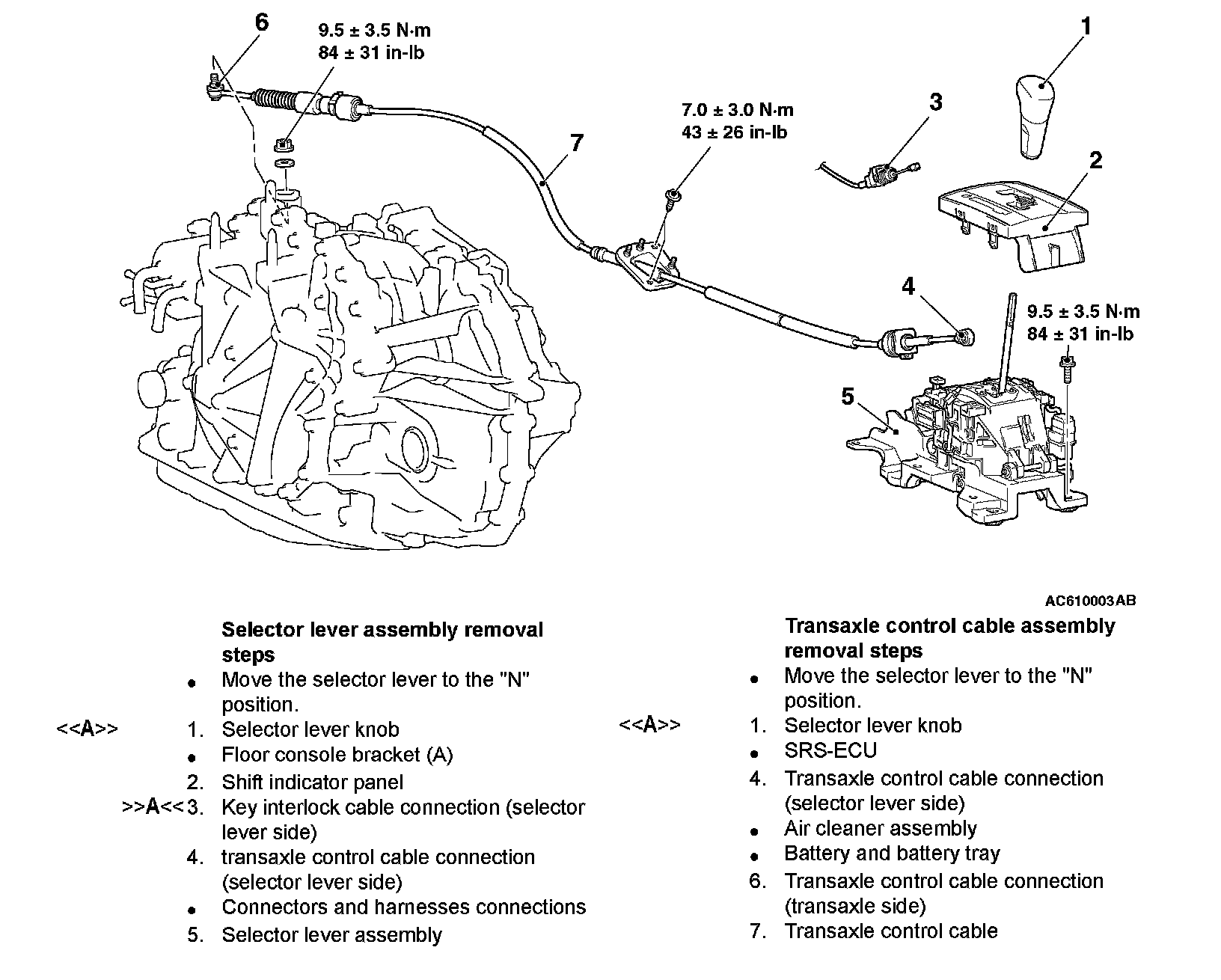 Be careful not to subject the SRS-ECU to any shocks during removal and installation of the transaxle control cable assembly.