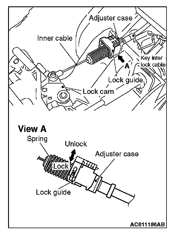 2. Install the tip of the key interlock cable to the lock cam of the selector lever assembly, taking care not to twist the inner cable.