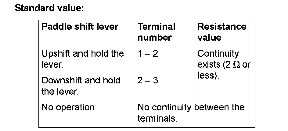 3. Check the continuity between the paddle shift switch connector terminals.