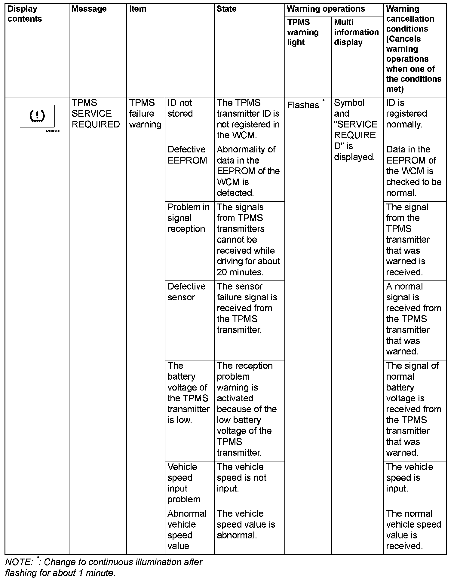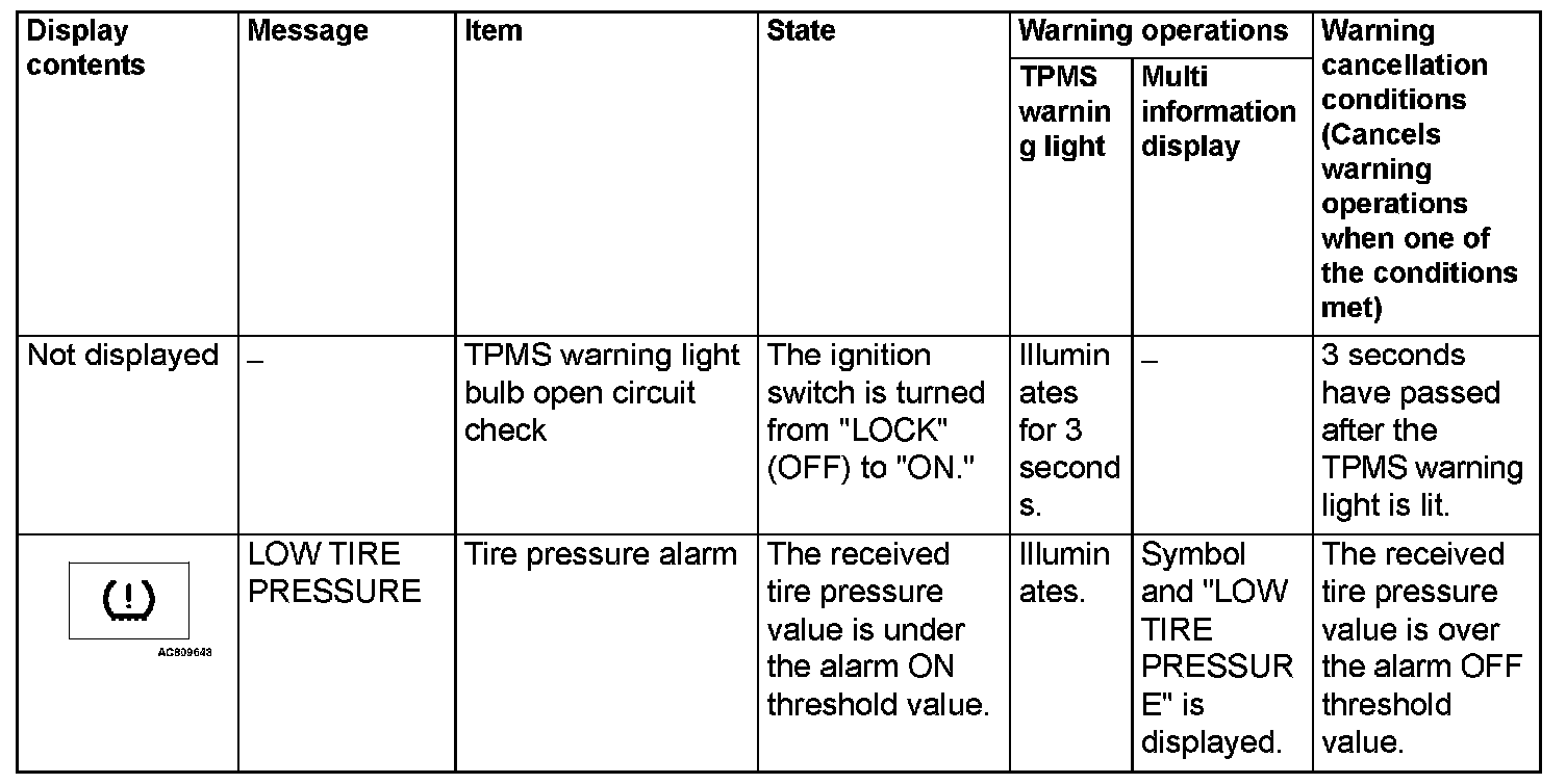 If the TPMS fails or the tire pressure is low, the WCM warns the driver of that state by the TPMS warning light and the multi information display in the combination meter.