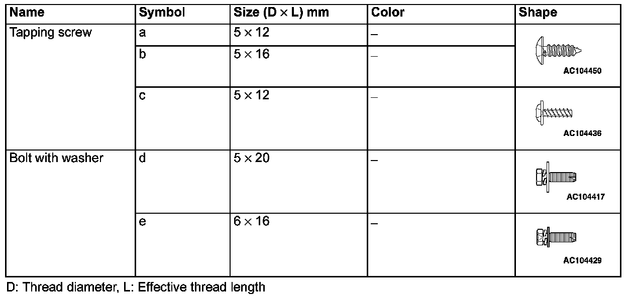 The following bolts and screws are used for installing the instrument panel. Bolts and screws are indicated as marks shown in the illustration in the sections of "Removal and Installation" and "Disassembly and Assembly".