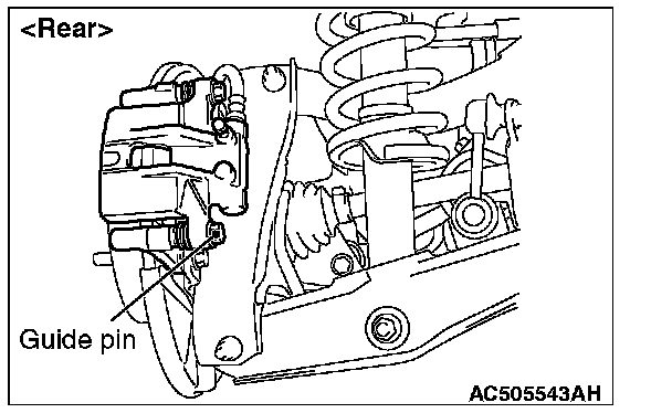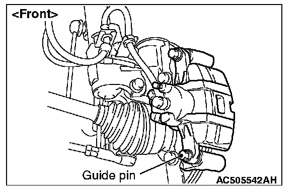 1. Remove the parts indicated in the figure, swivel the caliper body upward and retain it with a wire or similar tool.