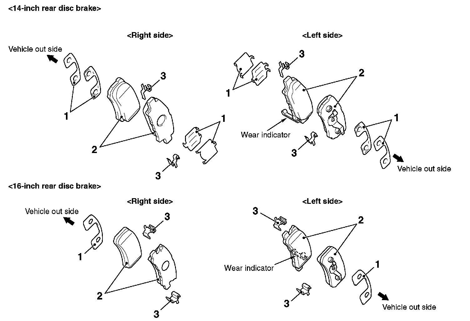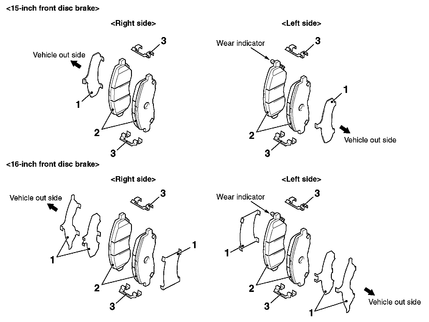 ^ The brake pad assembly with wear indicator is installed only to the inner side of the brake disc of the left-side brake at factory.