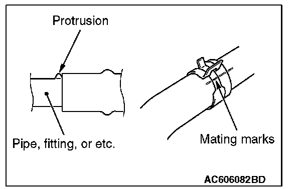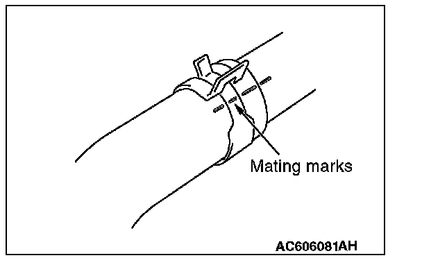 Make mating marks on the radiator hose and the hose clamp as shown to install them in the original position. Then, remove them.