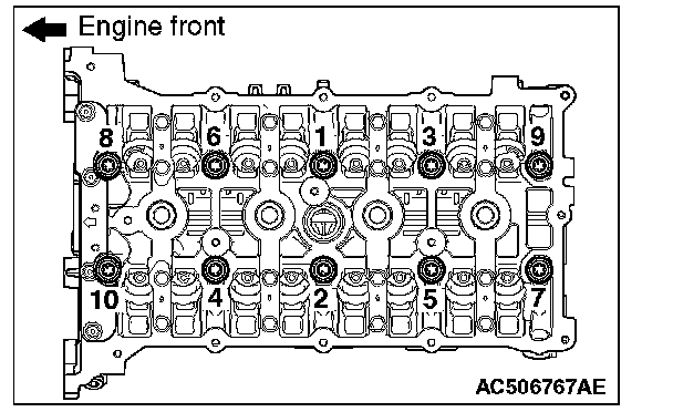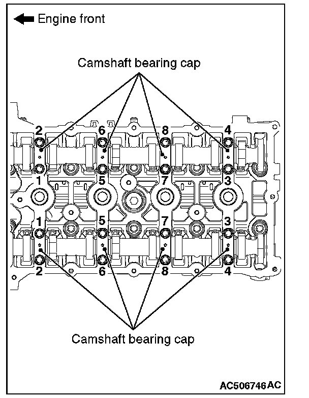 Loosen the camshaft bearing cap mounting bolts in the order of number shown in the figure in four or five steps, and remove the camshaft bearing caps.
