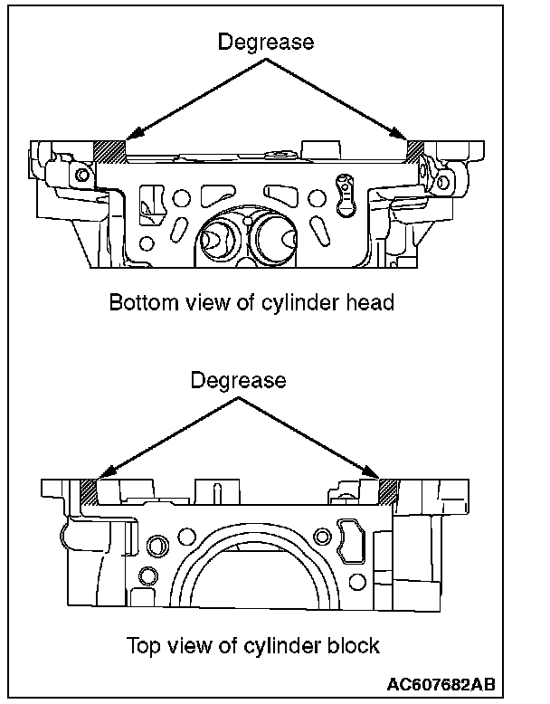 1. Remove the sealant and grease on the top surface of cylinder block and on the bottom surface of the cylinder head. Then, degrease the sealant application surface.
