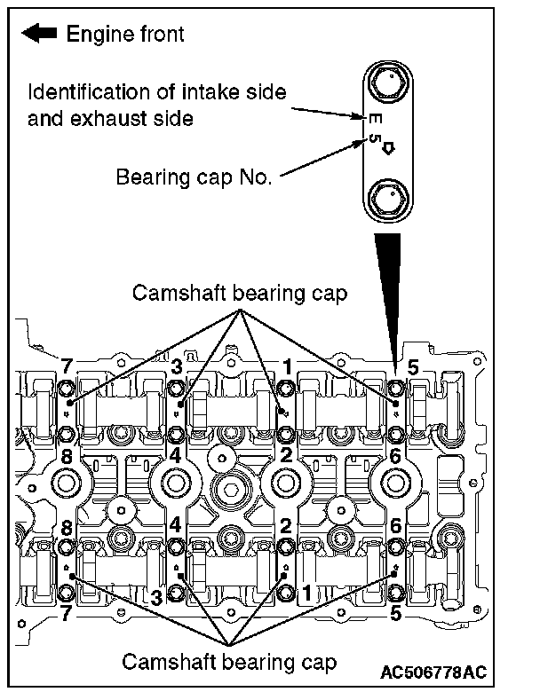 NOTE: Because the thrust camshaft bearing cap and camshaft bearing cap are the same in shape, check the bearing cap number and additionally its symbol to identify the intake and exhaust sides for correct installation.