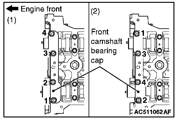 2. Tighten the front camshaft bearing cap mounting bolts again to the specified torque in the order of the figure (2.)