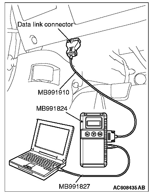 CAUTION: To prevent damage to scan tool MB991958, always turn the ignition switch to the "LOCK" (OFF) position before connecting or disconnecting scan tool MB991958.