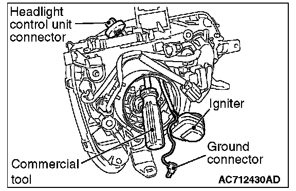 2. To insert the tool available in the market into the headlight assembly from the opening at the ignitor side, firstly remove the headlight control unit, the socket cover, the ignitor and the earth connector.
