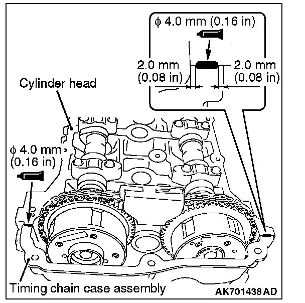12. After completely removing the liquid gasket adhering on the timing chain case, cylinder block and cylinder head, degrease them with white gasoline.