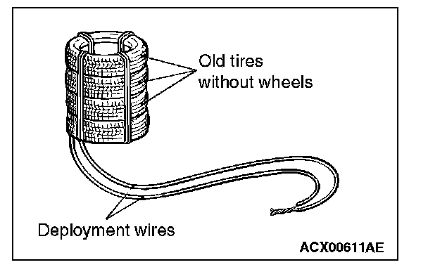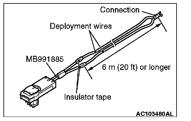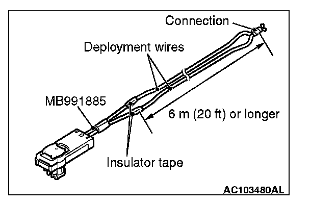 4. Connect deployment wires, each 6 meters (20 feet) or longer, to the two leads of special tool MB991885, and cover the connections with insulation tape. The other ends of the deployment wires should be connected to each other (short-circuited), to prevent sudden unexpected deployment of the air bag module.