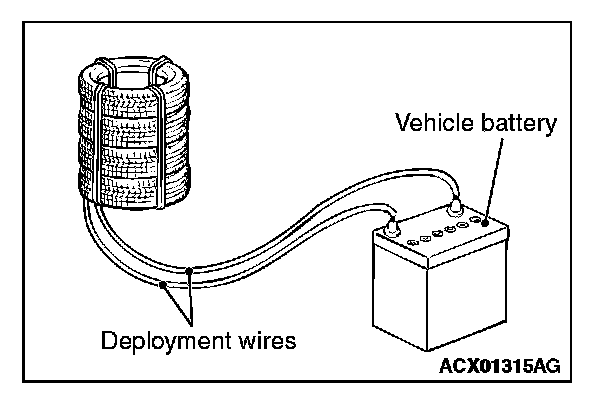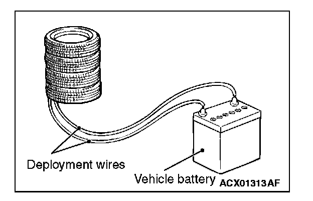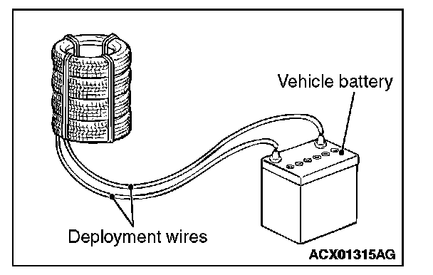 7. At a location as far away from the air bag module as possible, and from a shielded position, disconnect the two connected wires from each other, and connect them to the two terminals of the battery (which has been removed from the vehicle) to deploy the air bag.