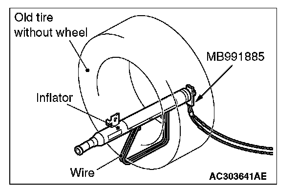 5. Pass the thick wire through the hole of air bag module mounting bracket. When, with the air bag module deployment surface facing upward, fit the module to the old tire with wheel.