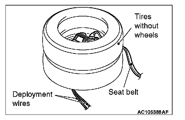 6. Place three old tires without wheels on top of the tire secured to the air bag module, and secure all tires together with ropes (four locations).