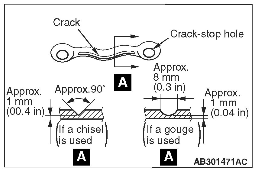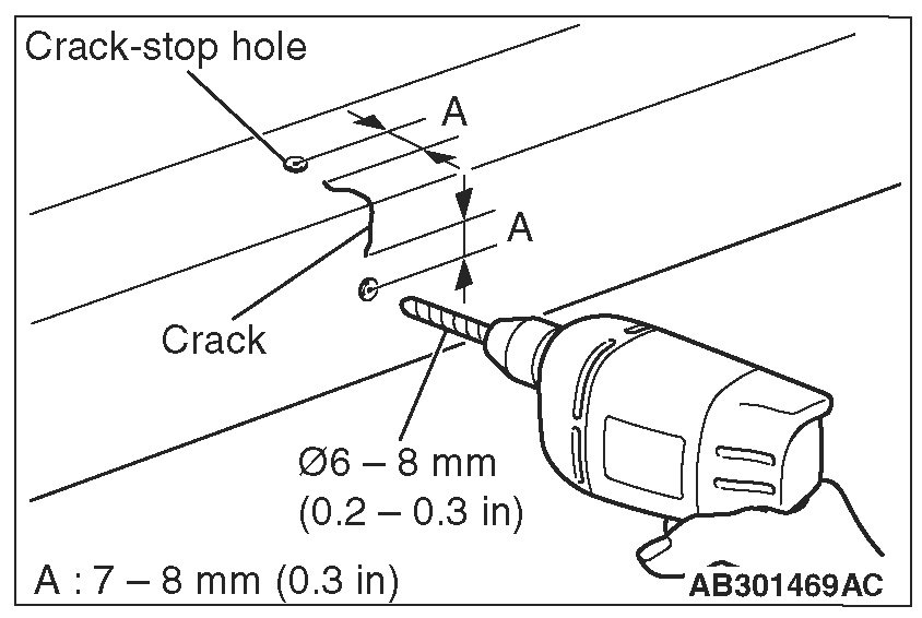 2. Make dia 6-8 mm (0.2-0.3 inch) holes (to prevent further cracking) by using a drill at points 7-8 mm (0.3 inch) from the crack ends.