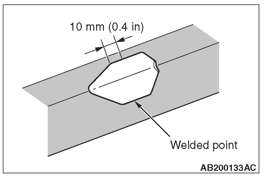 7. Attach the reinforcement plate to the repaired crack area by MIG welding. In order to avoid a concentration of stress at the time weld the reinforcement plate at points about 10 mm (0.4 inch) from its edges.