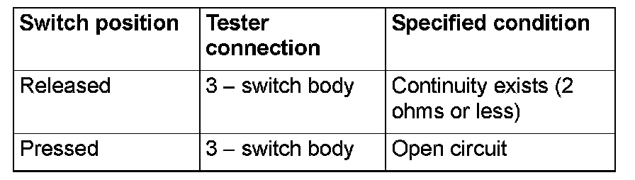 Remove the front door switch (LH). Then check the continuity between the switch terminals and the switch body.