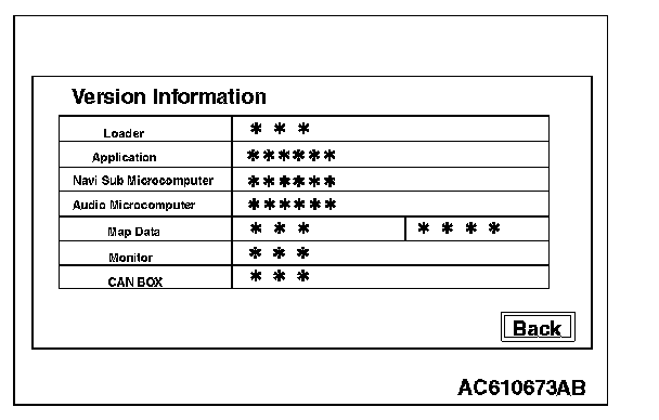 Displays versions indication (Loader, Application, Audio Microcomputer, Navi Sub Microcomputer, Map Data, Monitor, and CAN BOX).