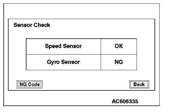 NOTE: If there is "NG" or "N/A" as the check results, select "NG Code" on the "Sensor Check" screen. Then "NG code Indication" screen will show the NG code.